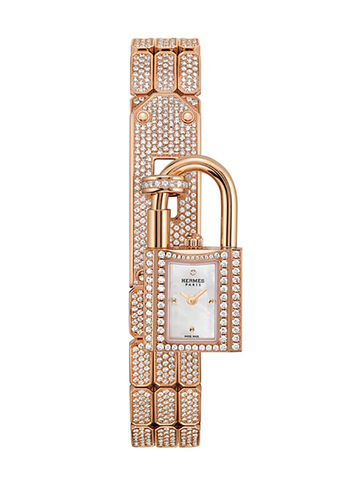 Kelly腕表的挂锁造型,源自品牌1930年所打造的同名Kelly手袋。今年,品牌以多种材质和元素演绎该表,包括精钢、玫瑰金,镶钻及无钻,珍珠贝母及漆面表盘。另外,该“挂锁”还可穿进品牌特别设计的小牛皮及鳄鱼皮套中,变成一款时尚项链佩戴!