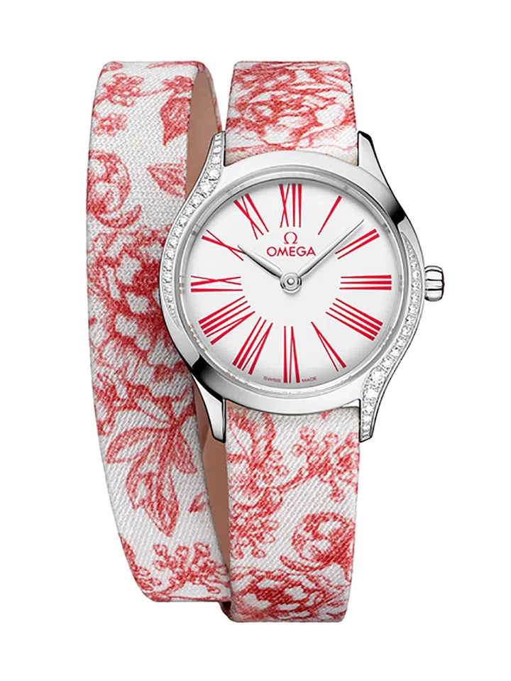 早前瑞士表牌Omega月前在泰国举办“Her Time”主题展, 全球品牌大使韩素希在出席曼谷记者会时,穿着干练优雅的黑色马甲及长裤,并佩戴了这款以法国经典“茹伊印花”(toile de Jouy)装饰的新款De Ville Mini Trésor 双圈表带女表来“点亮”造型。