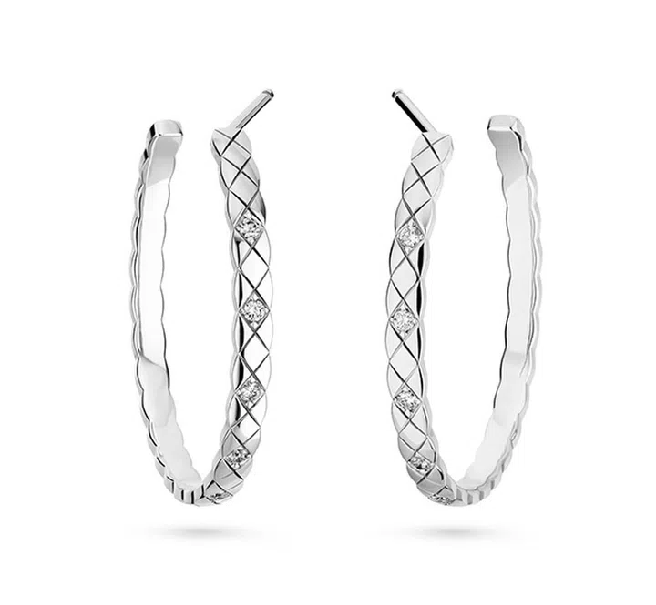 另外,还有同样以品牌首字母为灵感的超大耳环。装饰菱格纹及钻石的白金耳环,让你在新一年闪亮登场,另外也有无钻款米金或黄金耳环,价格$8,000。