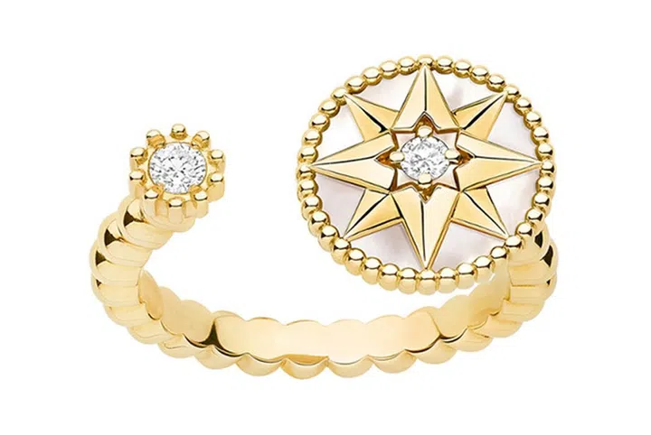 Victoire de Castellane也以罗盘玫瑰图案重新演绎Dior先生的幸运星“八芒星”,并与Mimirose系列同款璀璨钻石结合,令戒指更具华丽美。