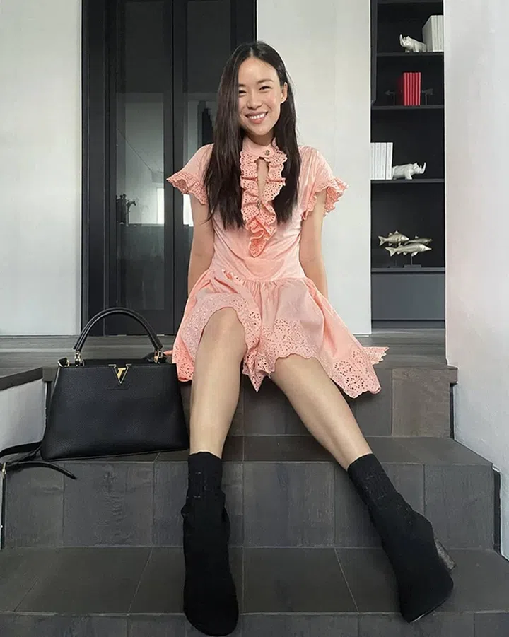 林慧玲在IG分享的新穿搭照中,身穿Louis Vuitton浅橘色荷叶剪裁连衣裙,搭配黑靴及黑Capucines包,为柔美的造型注入一丝酷劲!