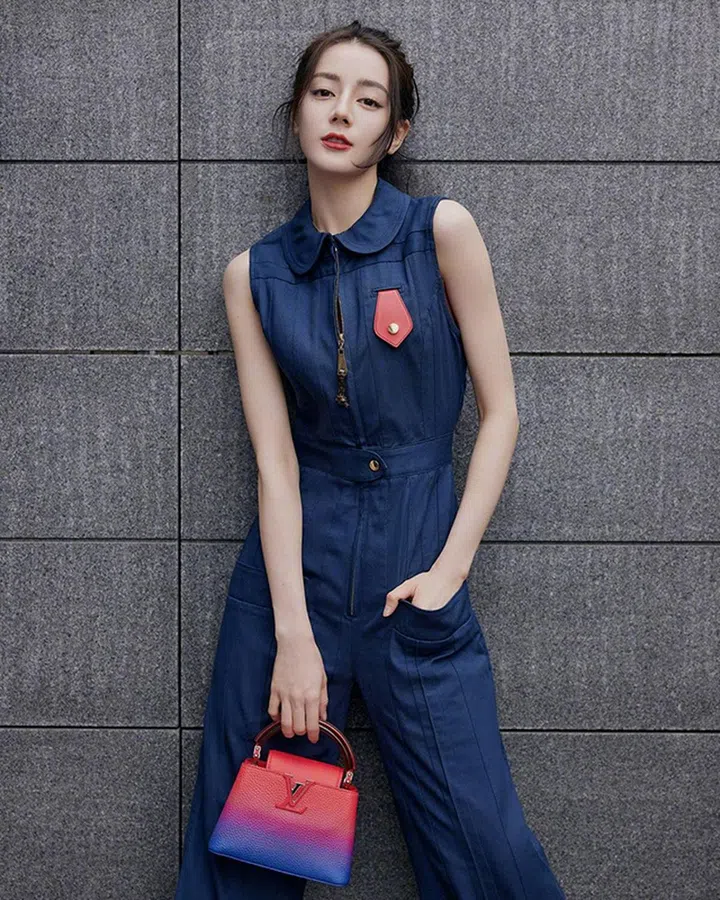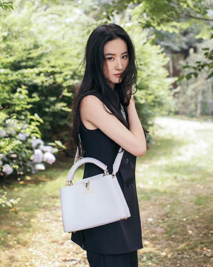 刘亦菲身为品牌代言人当然也率先在IG秀出自己的Capucines包,一袭黑绅士打扮穿出了干练的女强人范。