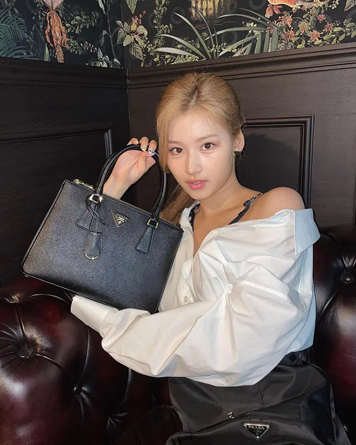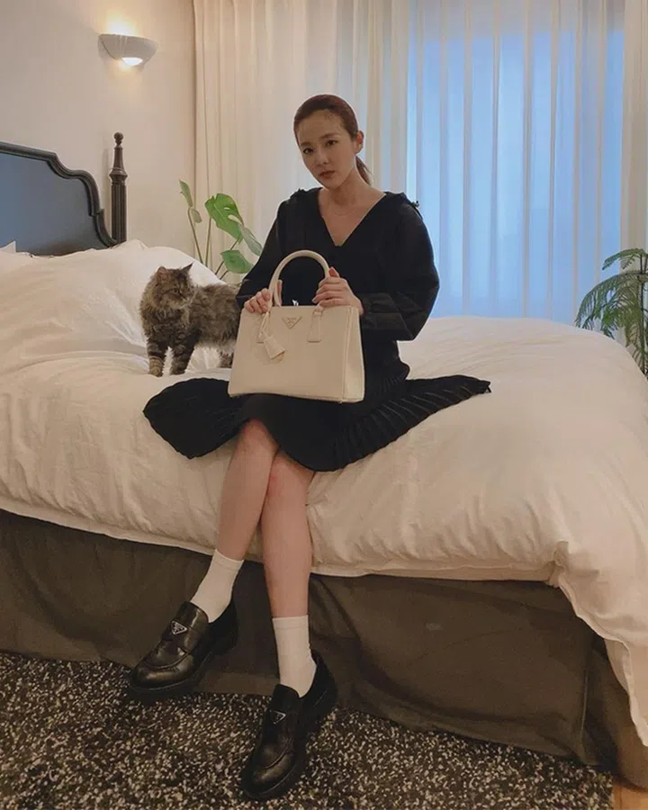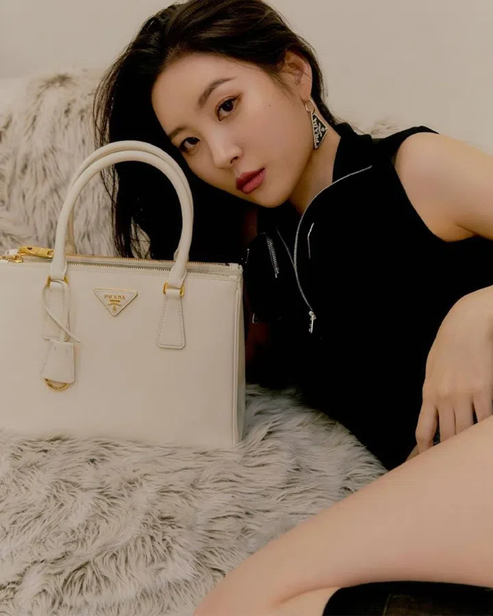 宣美这组在床上拍摄的穿搭照中,妙以Prada标记性的三角形logo耳坠呼应Galleria包上的logo,打造了和谐的matching时尚。
