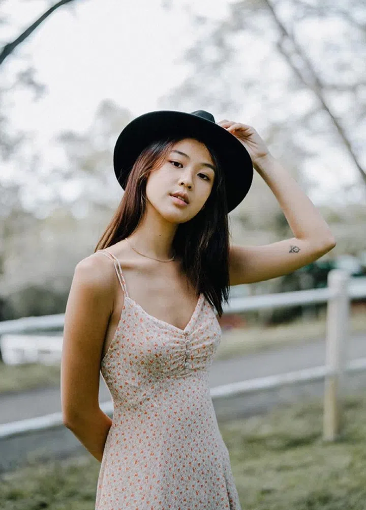 陈一心穿上小碎花吊带连衣裙,再戴了一顶软呢帽,流露出青涩的少女感。(她才21岁啦!)