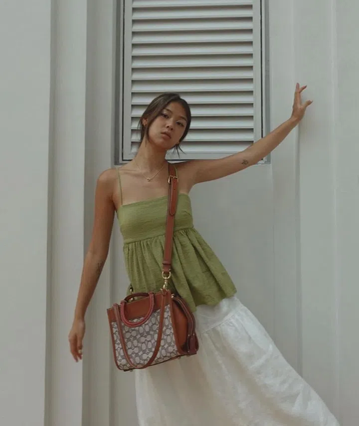 除了运动休闲风,陈一心也爱少女感的甜美造型。这身用色柔和的绿色吊带上衣+长裙的造型,即简约又有层次感。她还背上Coach #TheRogueBag,让造型更加分。