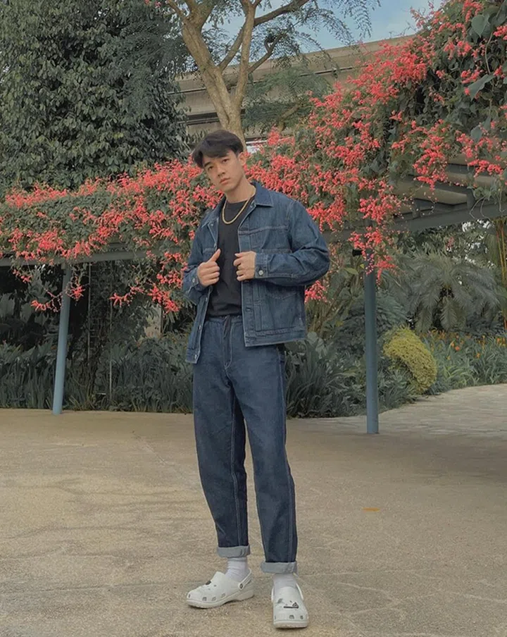 喜欢他这身个性印花套头衫和牛仔裤的搭配,看来休闲却充满活力。