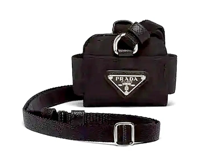 Prada男女皆可用的中性风耳机壳,饰有品牌的涂珐琅三角形金属徽标,全黑色设计经典不易出错。它也配有可调节长度的饰带,垂挂于颈部佩戴,另外招牌的尼龙材质也相当实用,不易磨损、清洗便利。
