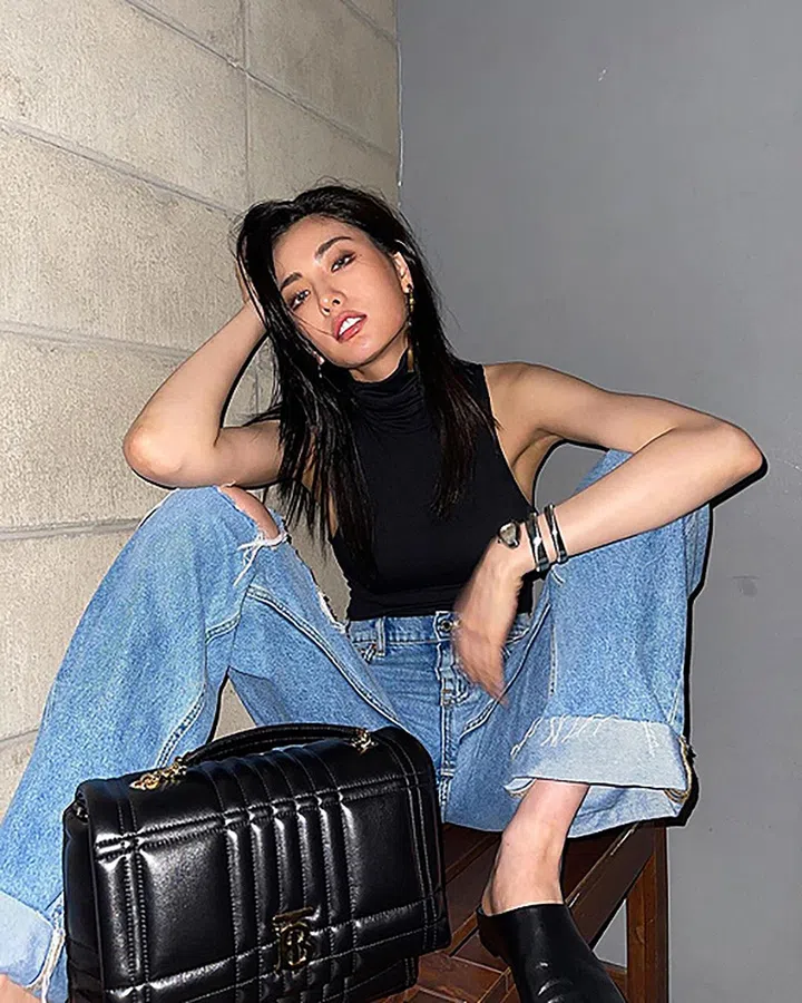 看到Celine标志性的金属双C环扣,原来林珍娜也爱背凯旋包!除了经典的黑色,这款包包还有灰色、米色、浅蓝色等多种颜色,让你可以依据自己平日的穿搭来选择。