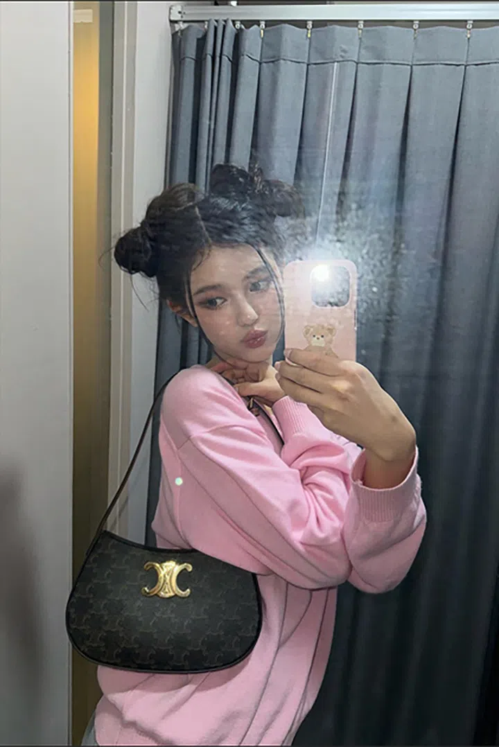 NewJeans成员Danielle,携带的这款肩袋是以Triomphe帆布及皮革打造的Celine中型Tilly肩袋,装饰金色Triomphe,风格经典有型。