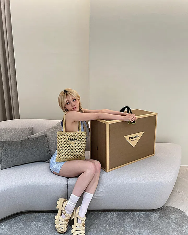 有“人间芭比”之称的Somi,身为Prada品牌大使,近日晒出品牌送来的夏日新品。其中这款以草编效果纱线钩编而成的提袋,袋身以镂空三角形元素为特色,再搭配Monolith crochet cage sandals,打造手袋及鞋履配对的“同款”造型。