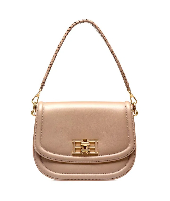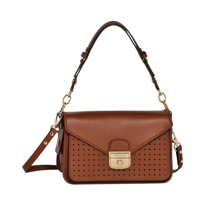 这款干邑色的肩袋兼具上班包的经典感,及休闲手袋的随性气质。手袋采用系列标志性按扣,其肩带可以拆卸,方便肩背或斜挎。小牛皮袋身上的镂空元素,也展现出放松、自由的法式态度。