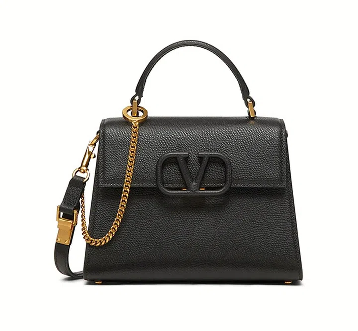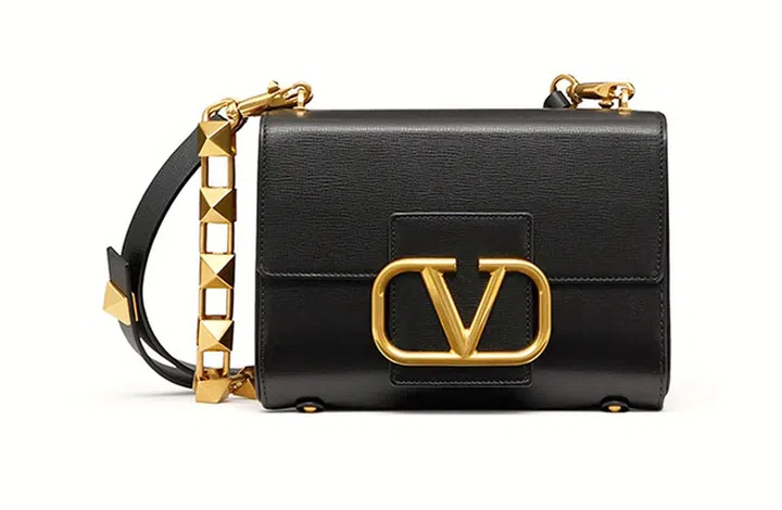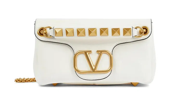 手袋装饰醒目的VLogo包扣及标记性铆钉元素(尺寸更大,彰显现代个性),长形轮廓也迎合了当下East West Bag的手袋风潮。