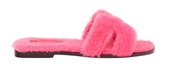 Hermes的Oran Sandal凉鞋,以其简约但极具代表性的H形设计深受欢迎。2021年秋冬系列中,这款经典的人气凉鞋推出了粉色的毛绒版本,彰显着Hermes独特的品牌美学和工艺。