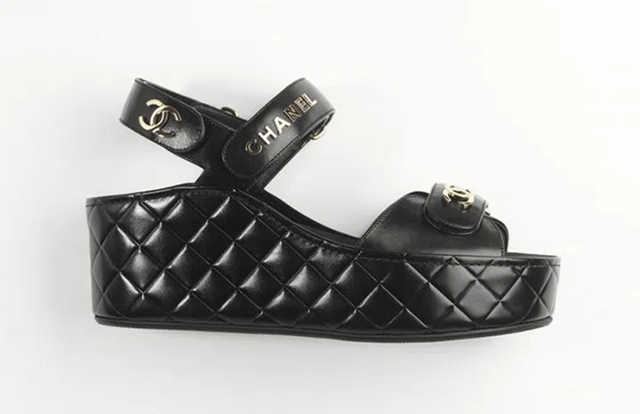 这双Chanel亮面小牛皮凉鞋采用厚底坡跟设计,跟部饰有品牌标志性的菱格纹图案,绑带处则缀以金属Chanel标志与字样,简约且大方,怎么搭配都不容易出错。
