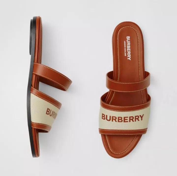 Burberry 这款双绕式凉鞋,选用缉明线皮革和帆布面料精制而成,宽幅的鞋面上装点着品牌名称,以中性配色与各色服饰和谐配搭。