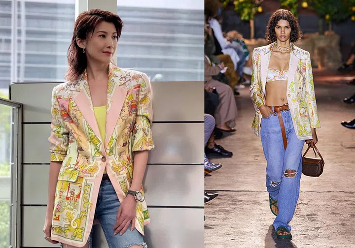 欧萱出席发布会时身穿Etro 2021春夏系列巴洛克风印花西装外套及牛仔裤,散发高冷的异域风——这也是她在第7集中的造型。