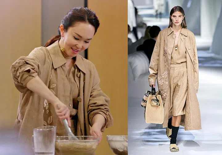 第5集片头,范文芳亲手做蛋糕回忆童年。她身穿的是Fendi 2021春夏系列新装,在大衣上的别致刺绣叶子巧妙地呼应蛋糕上的树林!