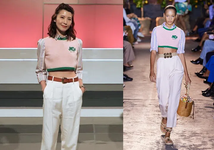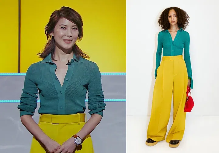 欧萱则以Bottega Veneta 2021早春系列的绿色polo衬衫及黄色西裤(跟范文芳一样是阔脚剪裁)亮相,完美演绎时尚版的“姐妹装”!