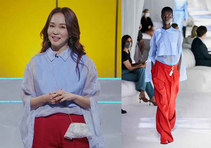 这集两人都以colour blocking造型登场,超有看头!范文芳身穿Fendi 2021春夏系列蓝色薄纱衬衫及红色西裤,还背了个迷你链袋上节目,为整体造型注入一丝俏皮感。