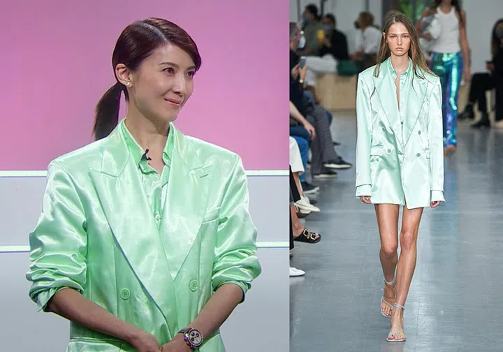 半决赛中,欧萱以Sportmax薄荷色西装外套及同色衬衫登场,大方秀出长腿展示高冷的tone-on-tone时尚。