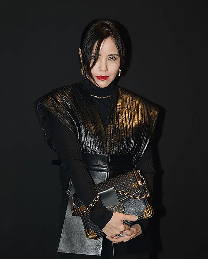 阿姐一身帅气黑衣,搭配Louis Vuitton Dauphine手袋,造型又飒又美。该手袋袋身装饰精细的Nanogram图案压纹,底角增加金属包角装饰,旨在致敬Louis Vuitton的传统制箱工艺。