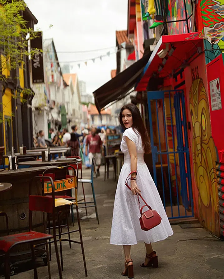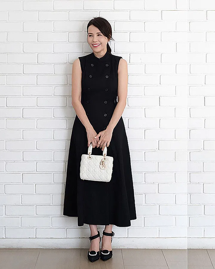 这身造型阿姐穿着Dior高雅经典的双排扣小黑裙,裙装采用高腰设计及蓬松的裙摆,风格复古却不失现代干练气质。搭配白色Lady Dior My ABCDior手袋,色调简约,端庄大方。