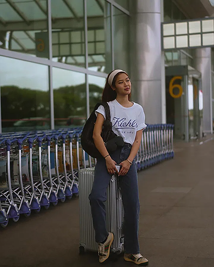 从陈一心所背手袋的纽结和intrecciato质地看,手袋是来自Bottega Veneta的Jodie肩袋。Jodie拥有不同尺寸,有可斜挎的大容量包包,也有体型适中的中型,及轻巧的小型和Teen尺寸。Jodie包款廓形柔软又轻盈,作为登机手袋,也是随性又有型的时尚款式。