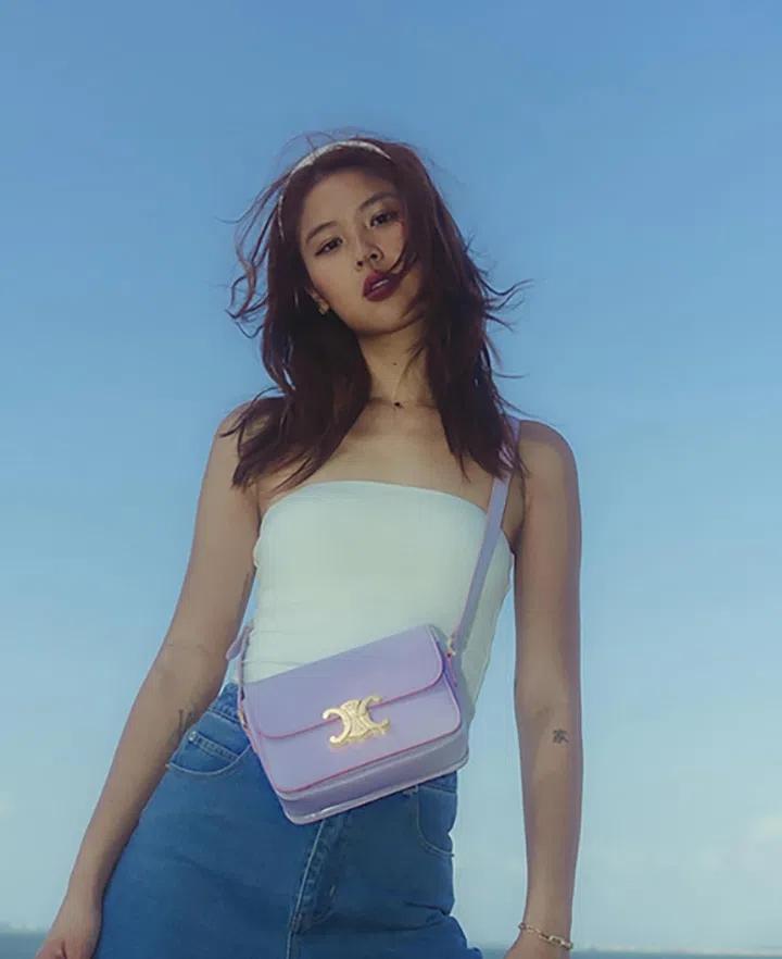 这款肩袋是来自Celine的Teen Triomphe款式,手袋装饰经典又具辨识度的Triomphe金属包扣,手袋大小适中,日常工作或旅行都是很实用的尺寸。除陈一心所背的薰衣草色外,今季新推出的柔美“花粉色”也推荐给你。