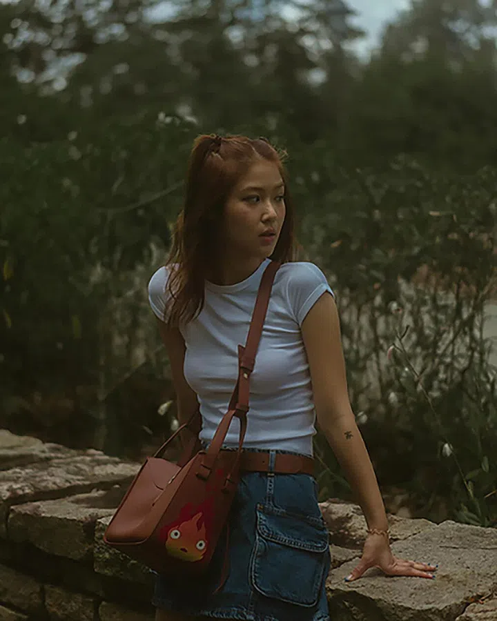 该手袋来自Loewe今年早前推出的与Studio Ghibli合作的第三个联名系列:Howl’s Moving Castle(2004年动画),同时这也是该系列合作的最终章。陈一心的手袋是带有Calcifer“火恶魔”的Compact Hammock手袋,可以手拎,也可以用可拆卸的肩带斜挎。
