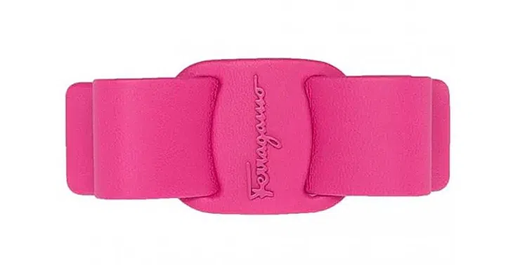 Salvatore Ferragamo这款独特的蝴蝶结发夹,灵感来自品牌经典Vara鞋履上的扣饰,设计充满辨识度。另一亮点是采用皮革制作,缀有品牌的名字,可爱的桃红色系也让发型更添活泼元气感。