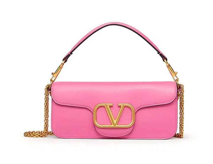这款VLogo Signature手袋采用粉色调的光滑小牛皮,袋身装饰黄铜色VLogo金属硬饰,轮廓颀长,可手拎也可肩背,并有鲜亮黄色及黑色款可选。