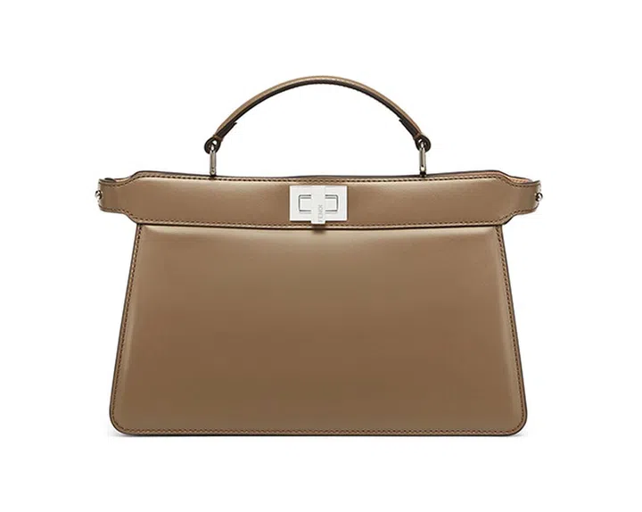这款水平设计的Peekaboo ISeeU East-West手袋采用低调奢华的灰褐色小牛皮,内里含两个隔层并采用温柔的浅粉羊皮内衬,配备可拆卸肩带,可轻松斜跨也能当作晚宴包使用。