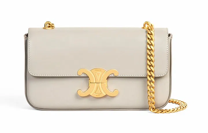 Celine新推出的袋款中,也包括不少造型简洁大方,轮廓稍显“横长”的优雅款式。比如这款装饰Triomphe金属包扣的浅灰色链袋,也是外部为小牛皮材质,内里为羊皮内衬。