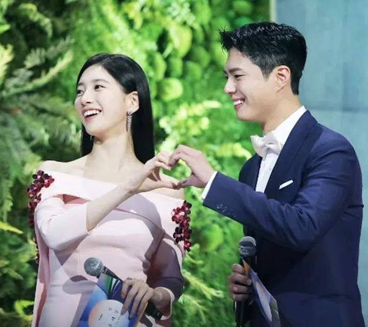 裴秀智连续主持百想7年,这次和申东烨和朴宝剑一起搭档。其中还和退伍后在百想艺术大赏上回归的朴宝剑一起比心,上图她身穿伦敦品牌Safiyaa的礼服,并搭配了Chaumet珠宝。