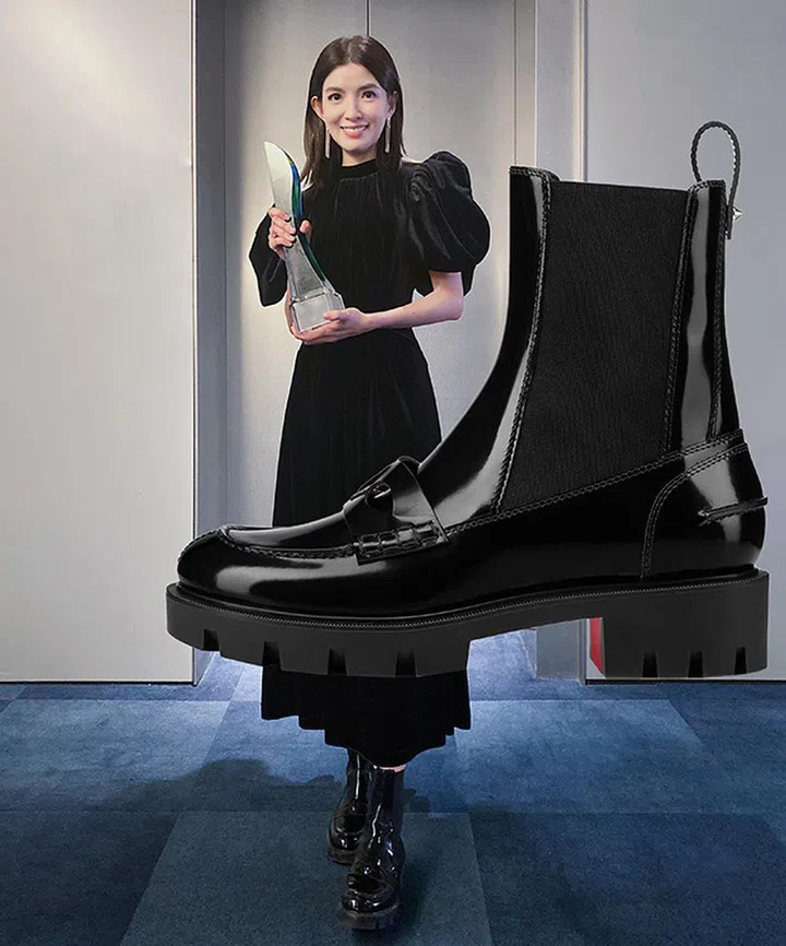 郭美美穿着复古又甜美的Rotate Birger Christensen黑色泡泡袖连衣裙,并出其不意选择了Christian Louboutin Montezu Lug短版皮靴亮相。近看这款鞋其实非常有趣——是brogues鞋和Chelsea靴的合体。