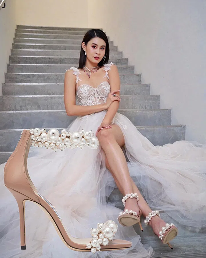 陈楚寰穿着唯美的白色蕾丝Berta礼服,搭配Jimmy Choo Maisel 100珍珠元素高跟鞋,走红毯时展示出修长双腿,可爱又性感。