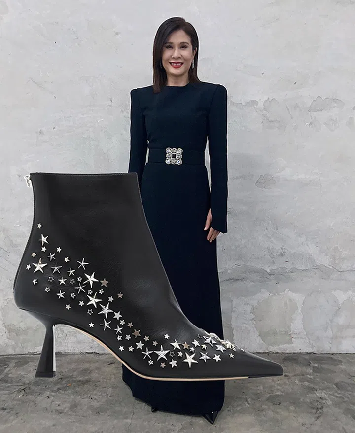 林梅娇的礼服以坚挺的肩型勾勒轮廓,水晶扣腰带也让身材比例更显高挑。搭配黑色尖头Jimmy Choo Kix 65缀饰短靴,整体造型利落又霸气。