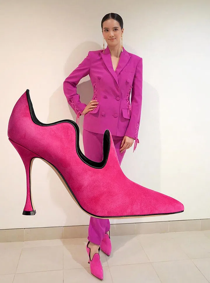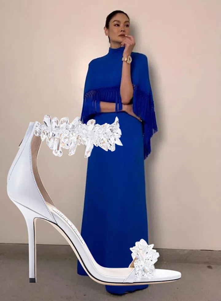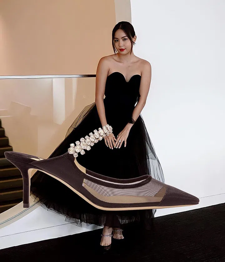 芳榕则以“黑天鹅”造型出场,以气质黑纱礼服搭配Jimmy Choo Bing 65穆勒高跟鞋。该鞋款的网面设计与服装低调呼应,鞋面上的水晶装饰也在黑色造型中显得格外抢眼。