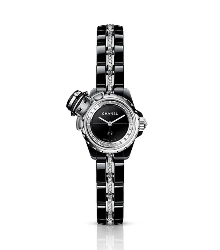 今年,品牌推出三款Mademoiselle J12限量腕表(限售55枚)Mademoiselle J12 La Pausa、Mademoiselle J12 XS及J12 Gabrielle Caliber 3.1,将Mademoiselle Chanel的形象与经典J12腕表结合起来。其中这款Mademoiselle J12 XS腕表,表壳左上方装饰俏皮的Chanel女士形象,表链上也点缀璀璨钻石——在黑色陶瓷的映衬下更加瞩目。