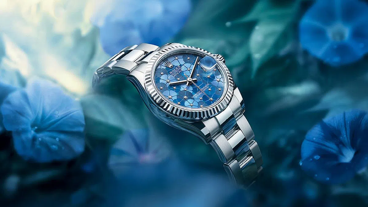 Rolex新款蚝式恒动日志型 31腕表,表盘图案由24朵花卉组成,拥有太阳光纹、哑光或粒纹三种饰面处理。除这款天蓝色花朵图案表盘的白色黄金钢(蚝式钢与白金的组合)款式外,品牌也推出以18K金材质的橄榄绿表盘腕表,以及永恒玫瑰金钢款(蚝式钢与永恒玫瑰金的组合)的银色表盘腕表。