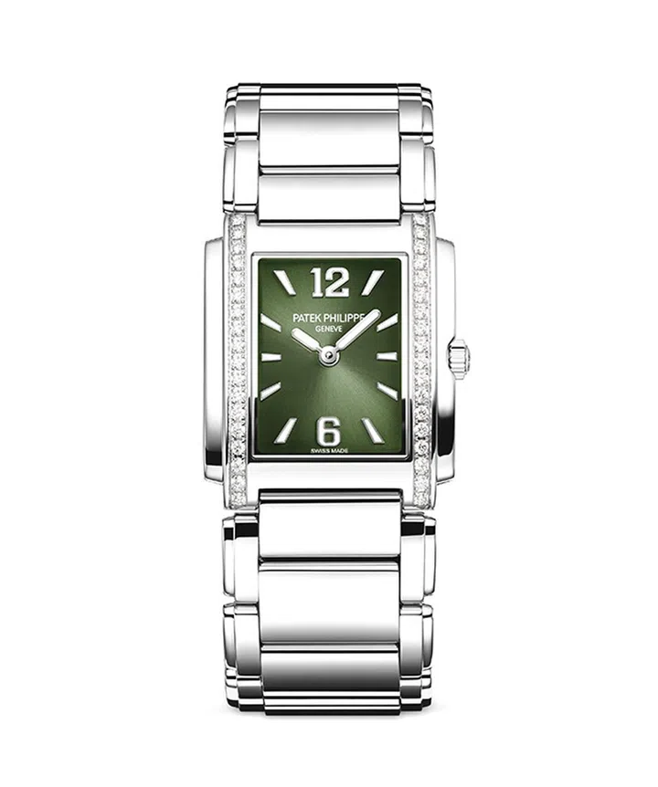 Patek Philippe对绿色情有独钟,自2004年便大胆选用前卫的绿色表盘推出女式腕表。去年,品牌再研制出橄榄绿色表盘,先后应用于Twenty~4(该系列最早诞生于1999年)与Nautilus两大标志性系列,而后也将绿色表盘运用到复杂功能系列当中。今年,在品牌演绎的常规系列腕表中,再度采用了雅致的橄榄绿色调。其中Twenty~4石英腕表造型简约、干练,表盘随角度和光线散发迷人的绿色光泽,12时和6时位置采用立体字块,搭配立体梯形时标及巴顿式圆头指针,两侧还装饰璀璨钻石。此外,其装饰艺术风格的表壳结合线条流畅的精钢表链,也让你佩戴起来舒适又显优雅。