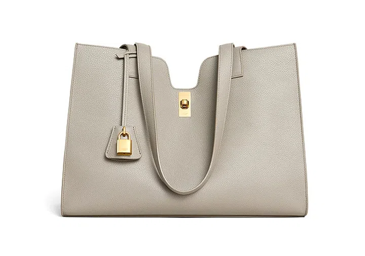 优雅的卵石色柔软粒面皮革替提袋,采用金色硬饰及旋转锁扣开合及Cloche Clés挂锁,外部为牛皮,内部为羊皮革衬里,不张扬却传递出一种对于品质和细节的尊重。