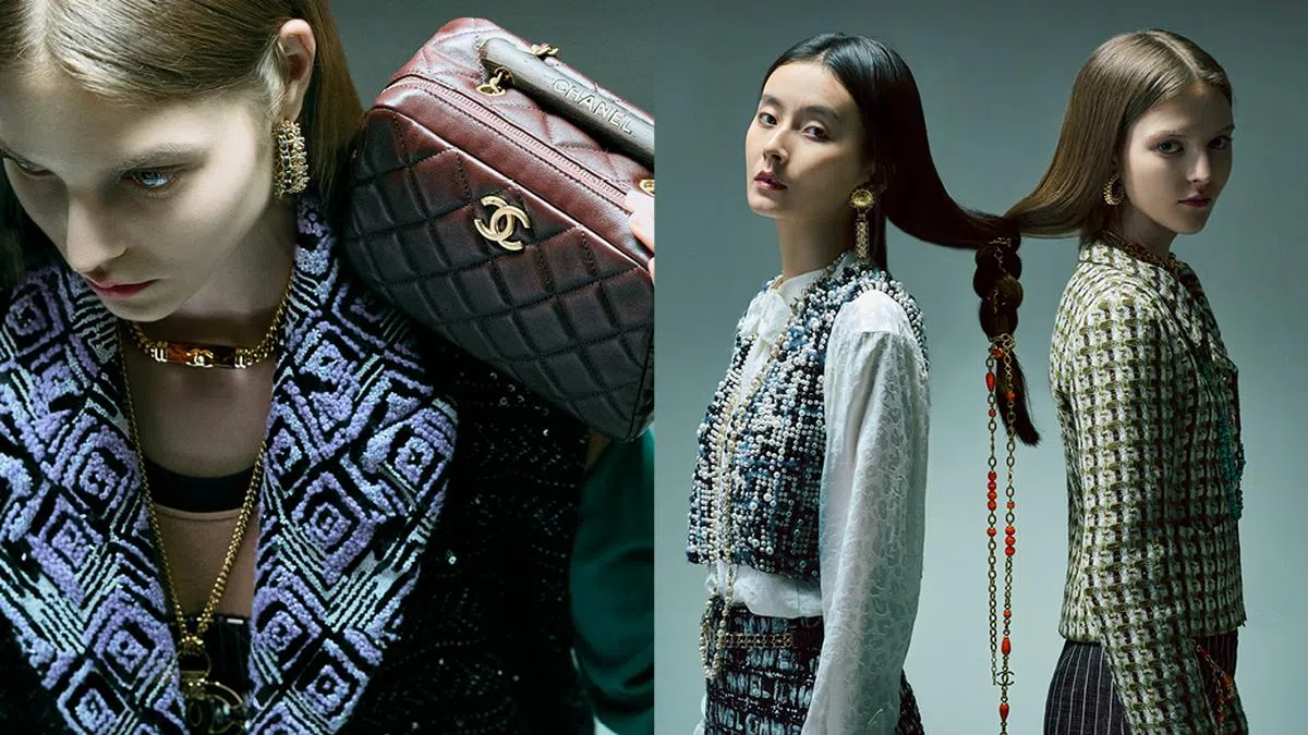 (From left) Chanel真丝双绉提花衬衫、木珠缀饰丝纱无袖外套、花呢长裙、镶水钻及皮革金属耳坠、镶水钻及人造珍珠金属长项链、镶水钻金属手镯、金属及皮革腰带;Chanel花呢外套、棉质长裤、镶人造珍珠金属耳坠、镶人造珍珠金属颈链、镶人造珍珠及水钻金属长项链、玻璃珠饰金属腰链、镶人造珍珠金属项链 (当发饰)