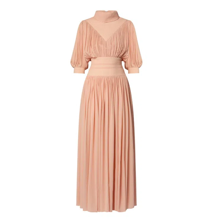 这款线条飘逸流畅,立体褶饰优美精细的长款连衣裙,其古典、温婉的优雅气质正好衬出了服装色调的亲和力。品牌的这一“浅粉色”,其实也很接近“柔和桃”。