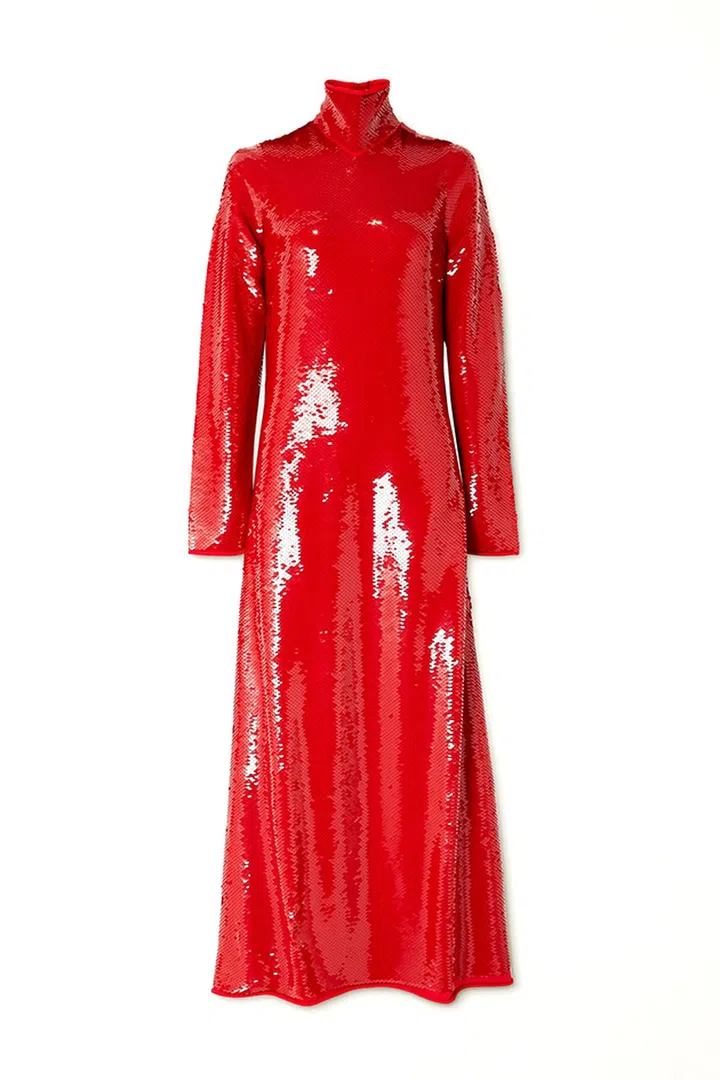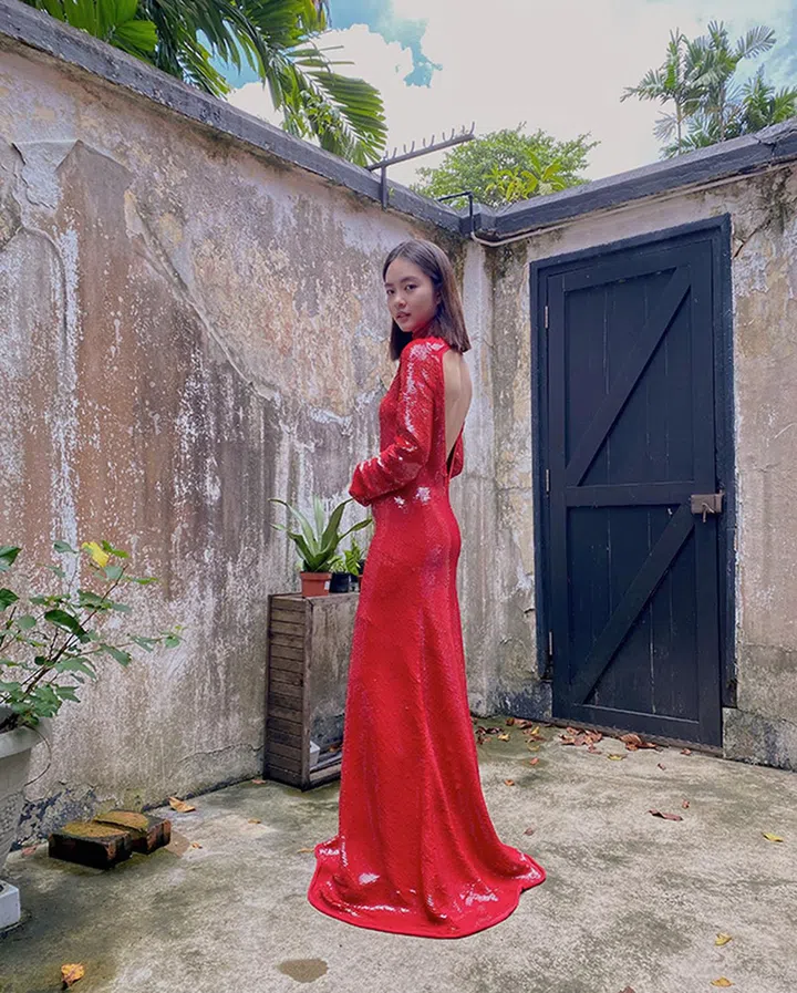 Donson:其实我去年12月就开始在找衣服了,当时看了品牌春夏的系列发现适合红毯的options并不多。突然想起covid前在米兰时装周看Bottega Veneta秀时有一套红色亮片礼服,模特走下T台时反射的光泽和衣服的律动很迷人,立刻问品牌公关是否能安排这件previous season的礼服。