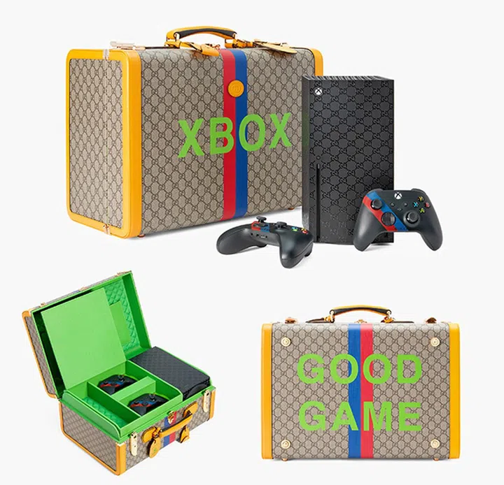 Gucci联名持续不断,近期更是破天荒地与微软公司的手柄游戏机品牌Xbox联手,首次推出100个限量版编号游戏套装。每套装包括一台带有GG图案激光雕刻的Xbox Series X主机,两只饰有Gucci红蓝条纹炭黑Xbox无线手柄。这些全都装在灵感来自Gucci档案行李箱的硬壳手提箱。外壳饰以经典的Gucci Supreme帆布,搭配金色扣环及黄色皮革饰边。大大的“XBOX”经典绿划过手提箱, 奢华中不忘初衷,游戏迷一眼就会认出游戏机品牌。手提箱的底部更是暗藏玄机,将Gucci品牌标志性的“GG”赋予双关语,解释为游戏界里常用的"Good Game"。