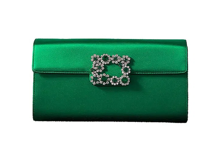 Roger Vivier这款祖母绿色的长形手握袋,尤其适合点缀华丽晚装造型。手袋在碧绿色缎布上装点与品牌经典鞋履同款的水晶缀饰方扣,并配备方便肩背的金属链条,方便你腾出双手参与酒会社交。