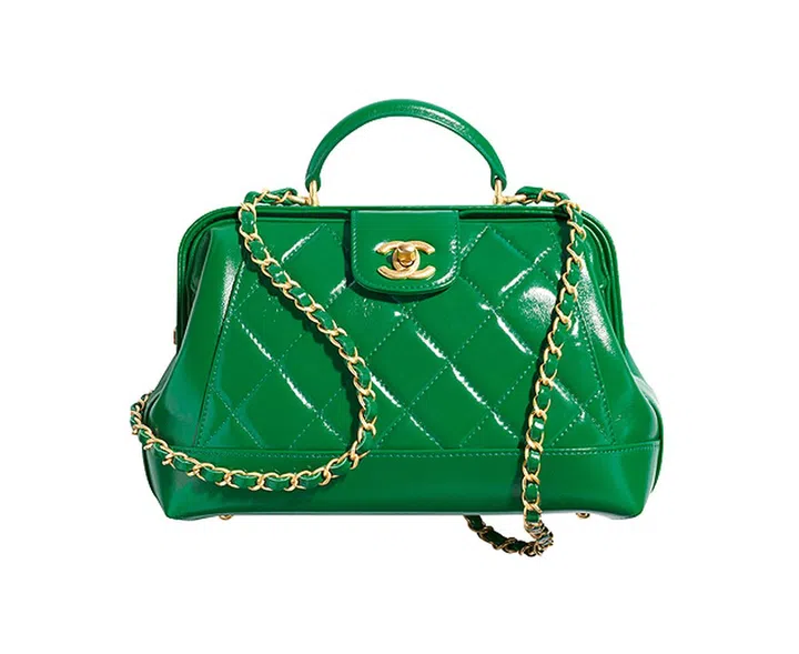 Chanel也推出葱绿的手提链袋,奢华的亮面漆皮与经典菱格纹设计相得益彰,标志性金色金属链条和“双C”包扣则为这款手袋增添精致感。