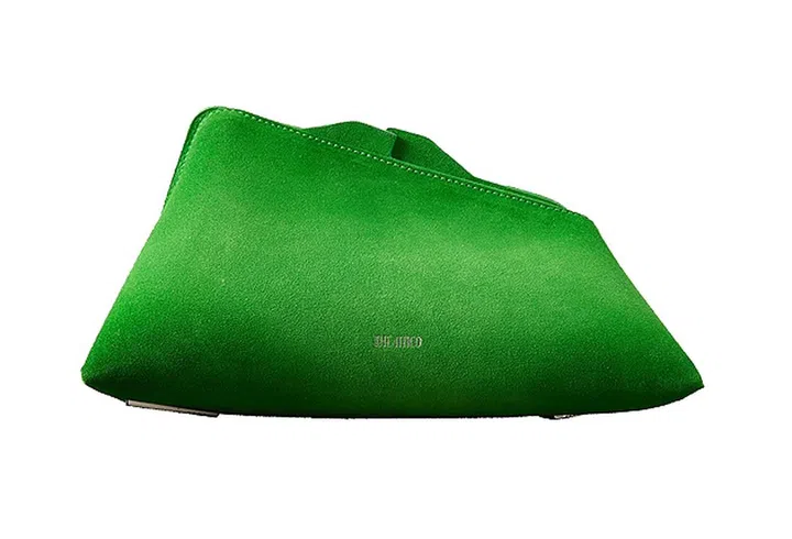 The Attico的手袋以一天中的不同时刻命名,这款“8.30PM”手握袋就是专为夜晚外出设计。该手袋尺寸适中,以独特的棱角造型为特点,并采用绿色麂皮材质,配有金属底座以保护袋身,实用又时尚。