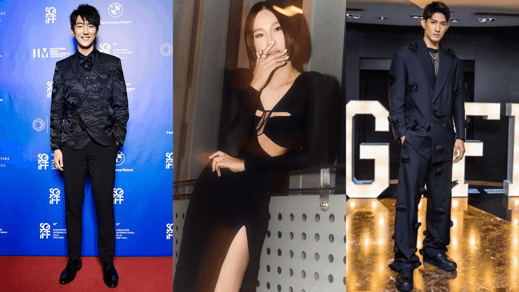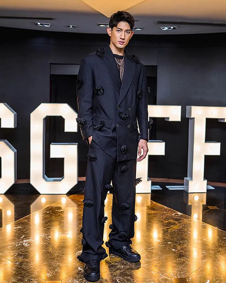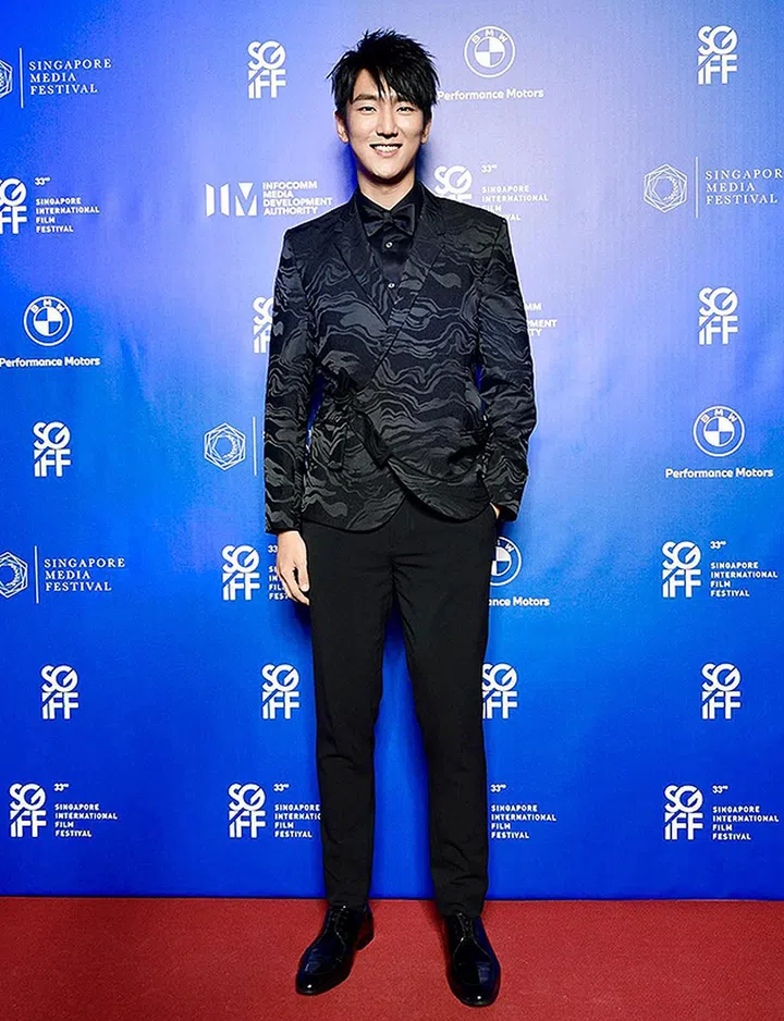 翟思铭穿着深色系西装,服装上的低调印花精致又华贵。如果喜欢类似雅致的抽象印花,可考虑Tom Ford、Yohji Yamamoto及Feng Chen Wang等品牌的西装设计。